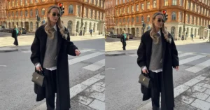 I’m enamored with this outfit – the neutral tones are so on-trend, and the layering is done to perfection. The elegant drape of the camel coat over the fitted turtleneck and high-waisted pants gives off a vibe that’s both luxurious and incredibly stylish.