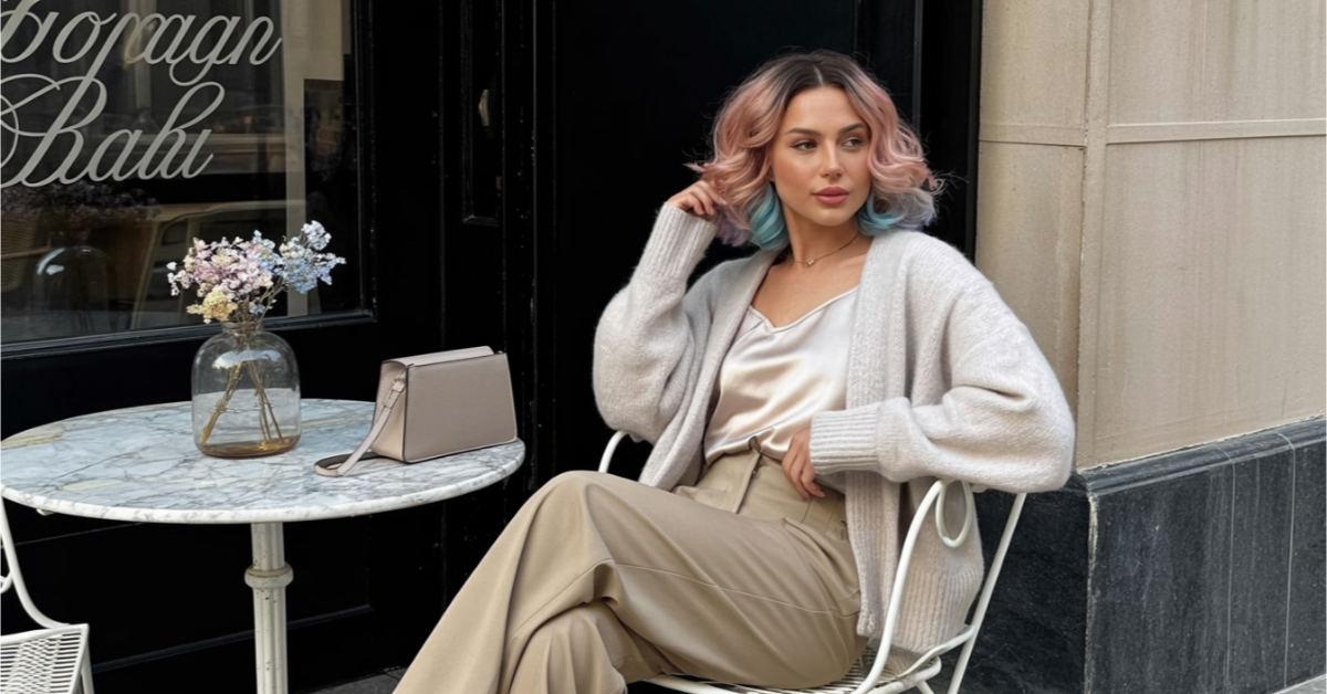 The pastel pink hair is so dreamy and whimsical, especially with those cute little accessories adding a playful touch. I love how it perfectly complements the soft, cozy vibe of the whole look.