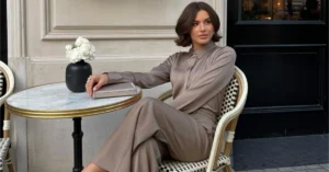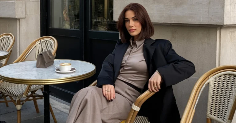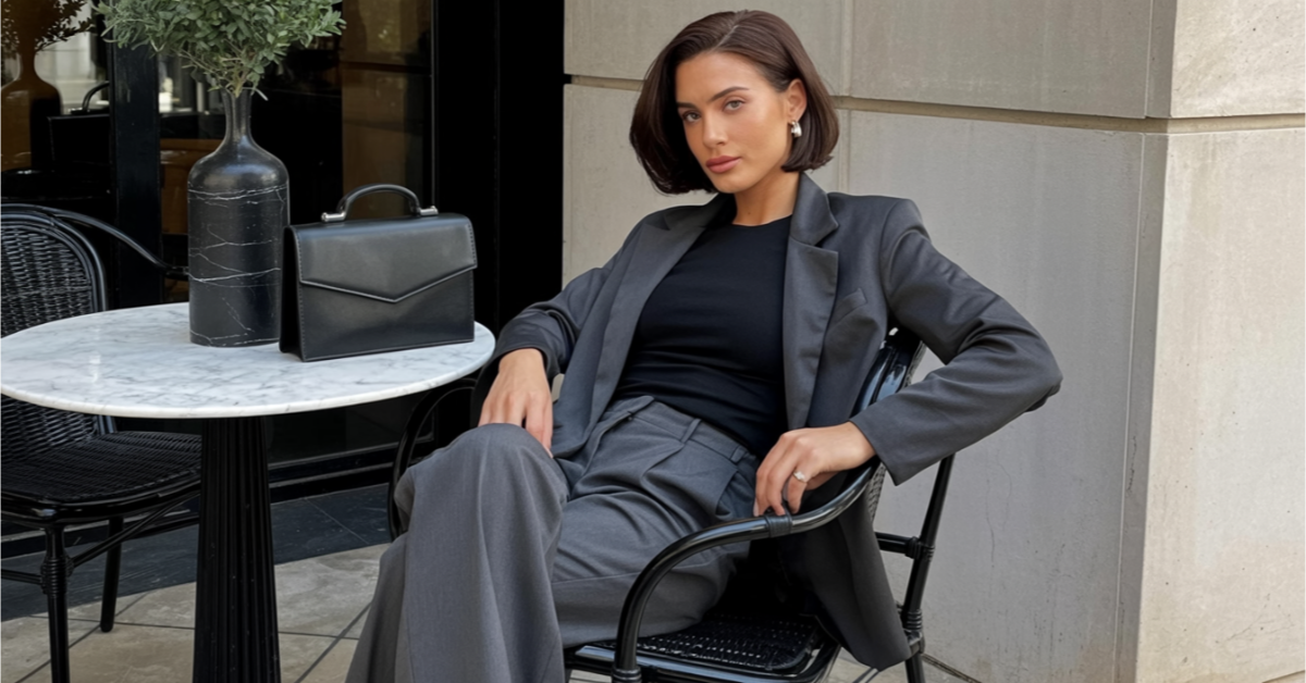 This outfit embodies the essence of chic minimalism – the fitted grey top tucked into high-waisted flared trousers creates a streamlined and elegant silhouette. The grey-on-grey color scheme is sophisticated and understated, making it a perfect choice for a day in the city.