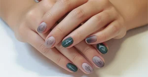 Ombre green nails fading from dark to light is so dreamy. The gradient effect adds interest without being too busy. This reminds me of nature and forests and all things earthy which makes sense for green obviously. My friend Leah got these for a hiking trip she took last summer and they were so perfect for the vibe. She said everyone at the campsite kept commenting on how cool her nails looked which is a fun way to make friends I guess haha. The ombre technique works especially well with green because theres so many natural shade variations to blend together.